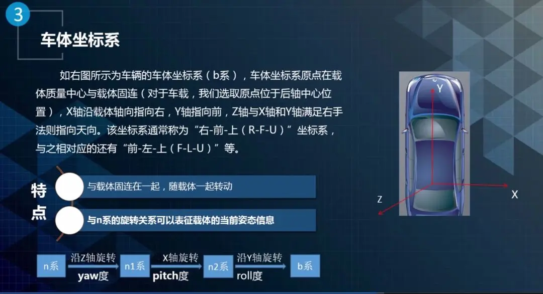 我们说了车体是个刚体,大家知道导航设备,关于imu经常安装在两个车轴中间,后面车轴的中间,这么做是保证它的稳定性,这个点我们称之为车的原点,然后我们在建一个包围盒,就知道车的每一位置的坐标了。我们建立这个坐标系是为了和当地坐标系匹配起来,然后去做计算,这个坐标系需要在我们所依赖的导航坐标系下知道它的位姿的变换,在utm坐标系下知道它的位置情况。车体坐标系一般情况我用一个rfu就是右前上,右边是x前面是y的话,上边就是z,三个就是rfu。这个坐标系是以载体固连在一起,它随着载体运动而运动,它是一个局部坐标系,它与n系(导航坐标系),或者当地水平坐标系,他们之间的旋转关系来表示现在车的姿态。因为前面讲enu东向北向天向,那这个车如果在这个坐标系下面,我们是一个什么样的姿态。我们就知道它的三个角度,和现在车体坐标系的三个坐标轴和原来坐标系之间角度的差异,就是它的姿态。