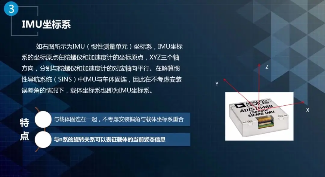 刚才说过imu就装在车体的一个点上,imu坐标系和载体坐标系一样,取决于我们安装,安装的时候有小误差,比如说现在安装的精度问题,有可能yaw角度上有一些误差,这些误差如果通过外参的方式把它补偿之后,它的坐标系和前面载体坐标系其实是一样的。它也是和载体固定连在一起,和n系有一个旋转关系。
