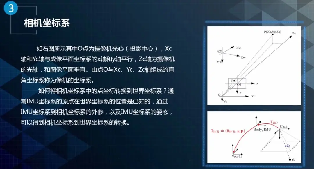 大家对相机比较熟悉,这个坐标系比较简单,就是以自己的光心为原点,xy一般有相平面决定,x朝右,y轴朝下建立一个局部坐标系。相机坐标系不会和其他全局坐标系直接连接起来,因为车已经选了一个原点,就是imu原点,把相机坐标系和imu坐标系关联起来,可以通过一个外参,它两个之间其实就差一个旋转和平移,如果把它算出来,我们就知道他们之间的一个刚性变化,比如我们知道imu坐标系世界坐标系的姿态和位置,就可以转化为相机坐标系。