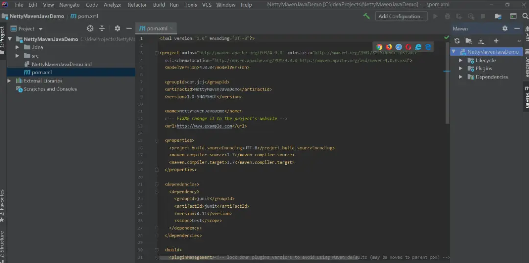 经过上面的步骤,我们的Maven工程就已经创建完毕,现在可以编写Netty的第一个程序,这个程序很简单,传输一个字符串,虽然程序很简单,但是已经能够大体上反映Netty开发通信程序的一个整体流程了。