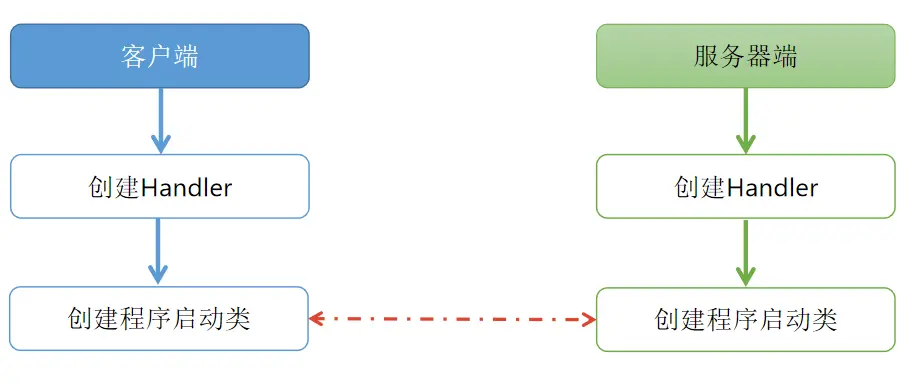 Netty开发的实际过程,这是一个简化的过程,但已经把大概流程表达出来了,绿色的代表客户端流程、蓝色的代表服务器端流程,注意标红的部分,见下图: