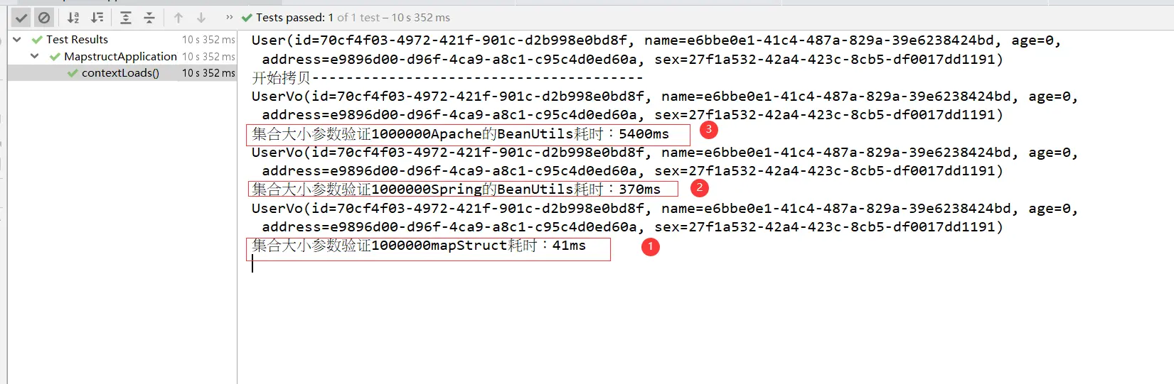 System.out.println("集合大小参数验证"+userVos.size()+"mapStruct耗时:"+(end-start)+"ms");