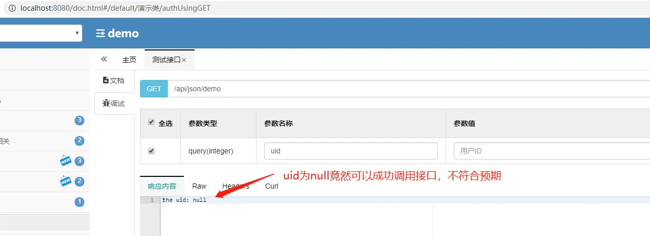 问题出在接口参数uid的必填性上,@RequestParam注解里require默认为true,要求必填,但@ApiImplicitParam注解里require默认为false,要求非必填,该业务接口在进行功能联调时,uid居然能得到一个null值,按照一般认知习惯@ApiImplicitParam注解的主要作用是生成接口文档,不应该对@RequestParam的属性有侵入性才对,目前反馈的bug,让我怀疑@ApiImplicitParam是不是会侵入@RequestParam的require属性?