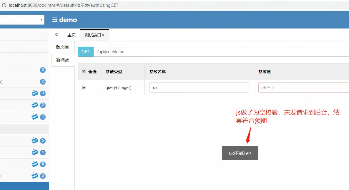 通过调试浏览器可以发现,为空校验是js完成的,js判断为空后,并未发起请求到后端,这样我们可以认为swagger内@ApiImplicitParam的required参数生效了。