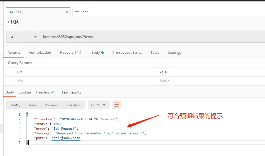 在前面我们使用postman测试接口时,发现参数项是空的,我们加上参数,但不写值测试后,结果让人诧异: