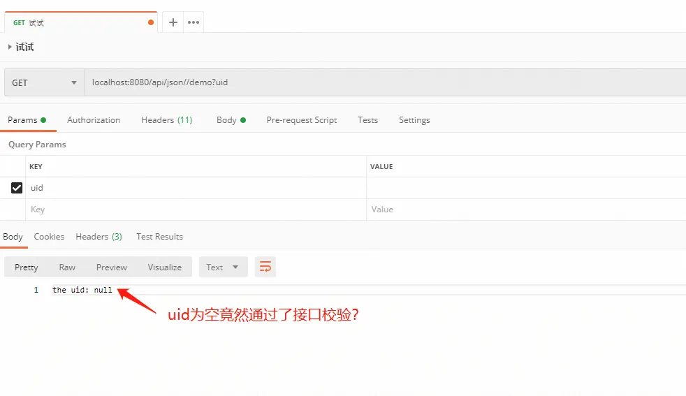 前面2个问题已经从源码中找到解释,来看第3个问题:如果参数设置required=true,但只是要求参数名存在,如果此字段是Long类型或Integer类型,写成uid=或'uid',也能通过校验,最终进入方法后,还是得手动写代码进行为空校验,这显然不是我们想要的结果?该如何解决呢?