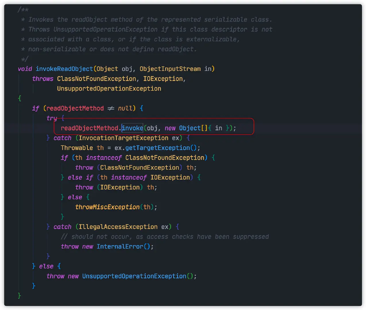 当我们调用 ObjectInputStream#readObject读取反序列化的数据,如果对象内实现了 readObject方法,这个方法将会被调用。