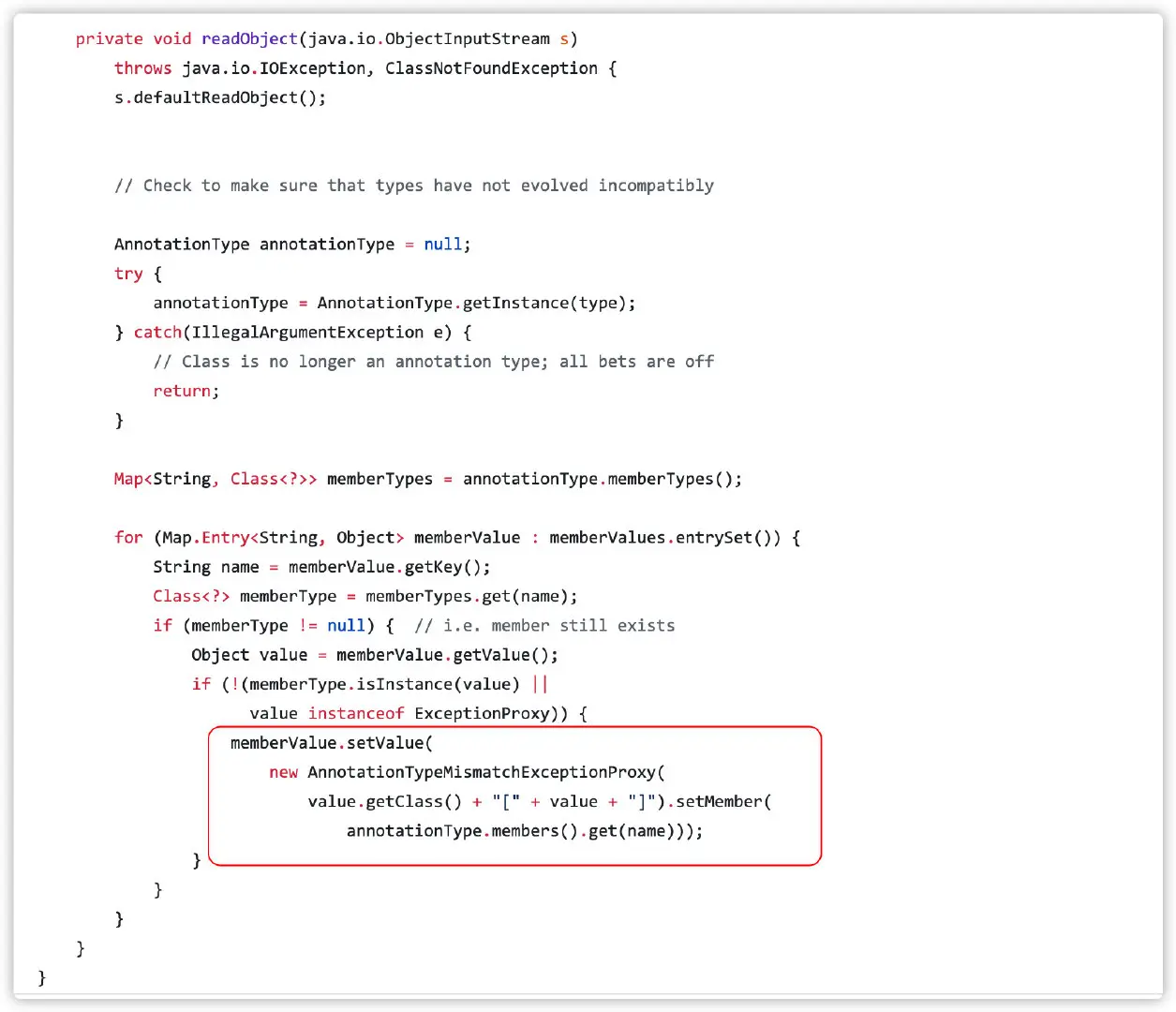 在 JDK 8 中,AnnotationInvocationHandler 移除了 memberValue.setValue的调用,从而使我们上面构造的 AnnotationInvocationHandler+TransformedMap失效。
