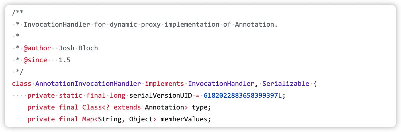 Java 中有一个类 sun.reflect.annotation.AnnotationInvocationHandler,正好满足上述的条件。这个类构造函数可以设置一个 Map 变量,这下刚好可以把上面的 TransformedMap 设置进去。