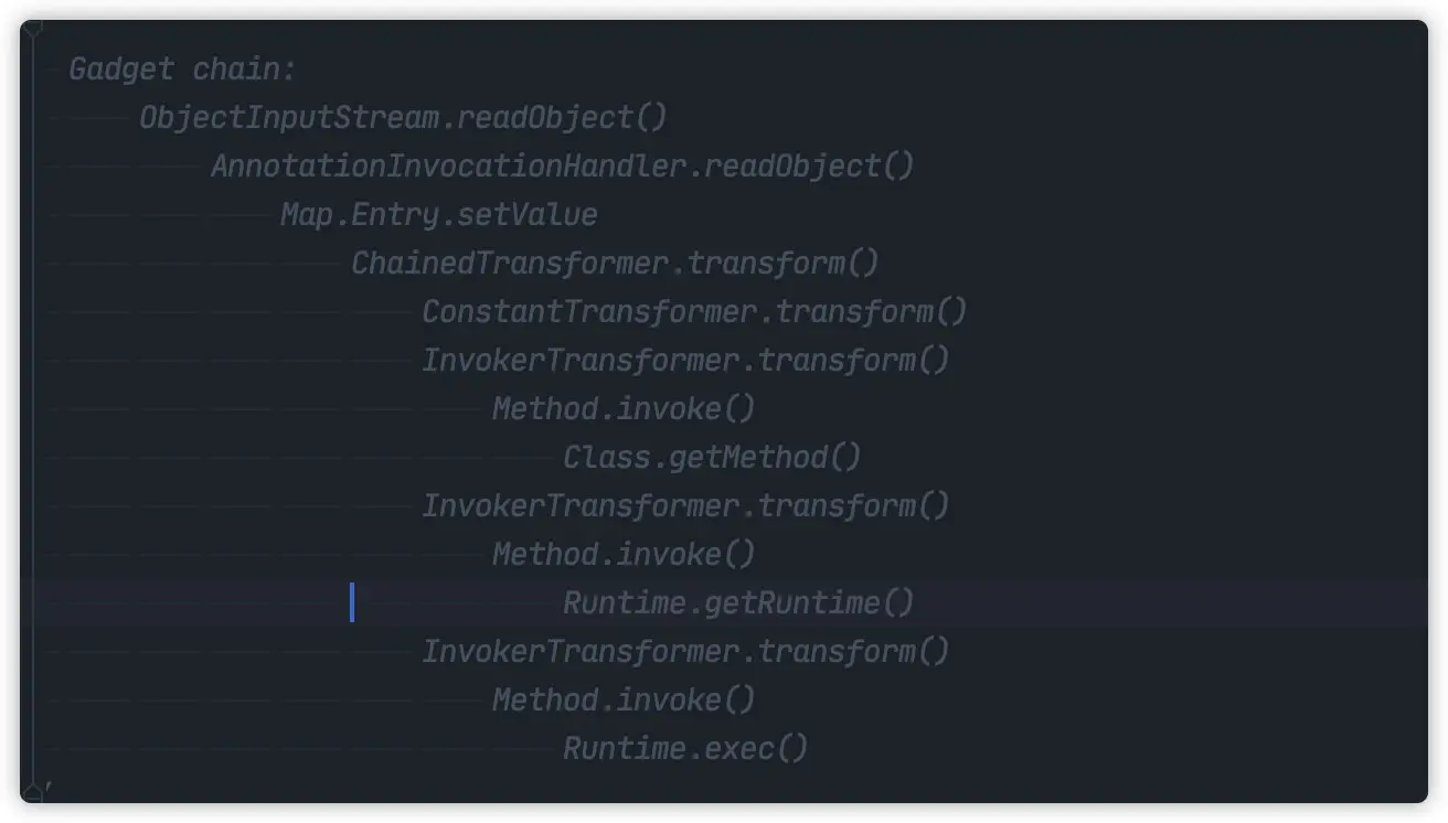 通过 ChainedTransformer 链式执行 ConstantTransformer,InvokerTransformer逻辑,最后我们成功的运行的 Runtime语句。