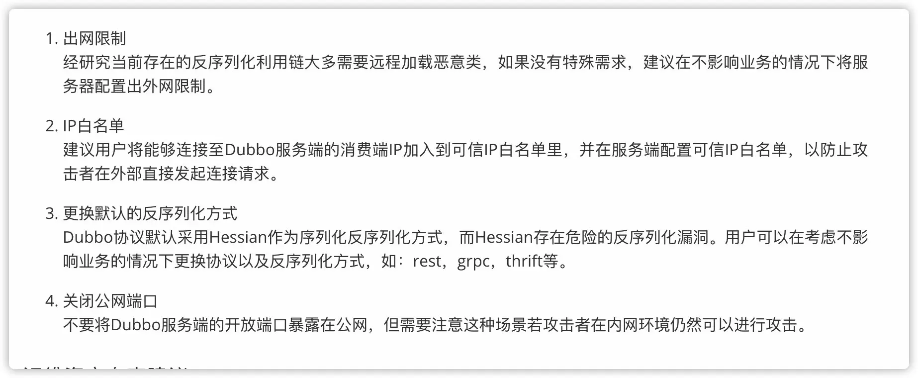 Dubbo 在 2020-06-22 日发布 2.7.7 版本,升级内容名其中包括了这个反序列化漏洞的修复。不过从其他人发布的文章来看,2.7.7 版本的修复方式,只是初步改善了问题,不过并没有根本上解决的这个问题。