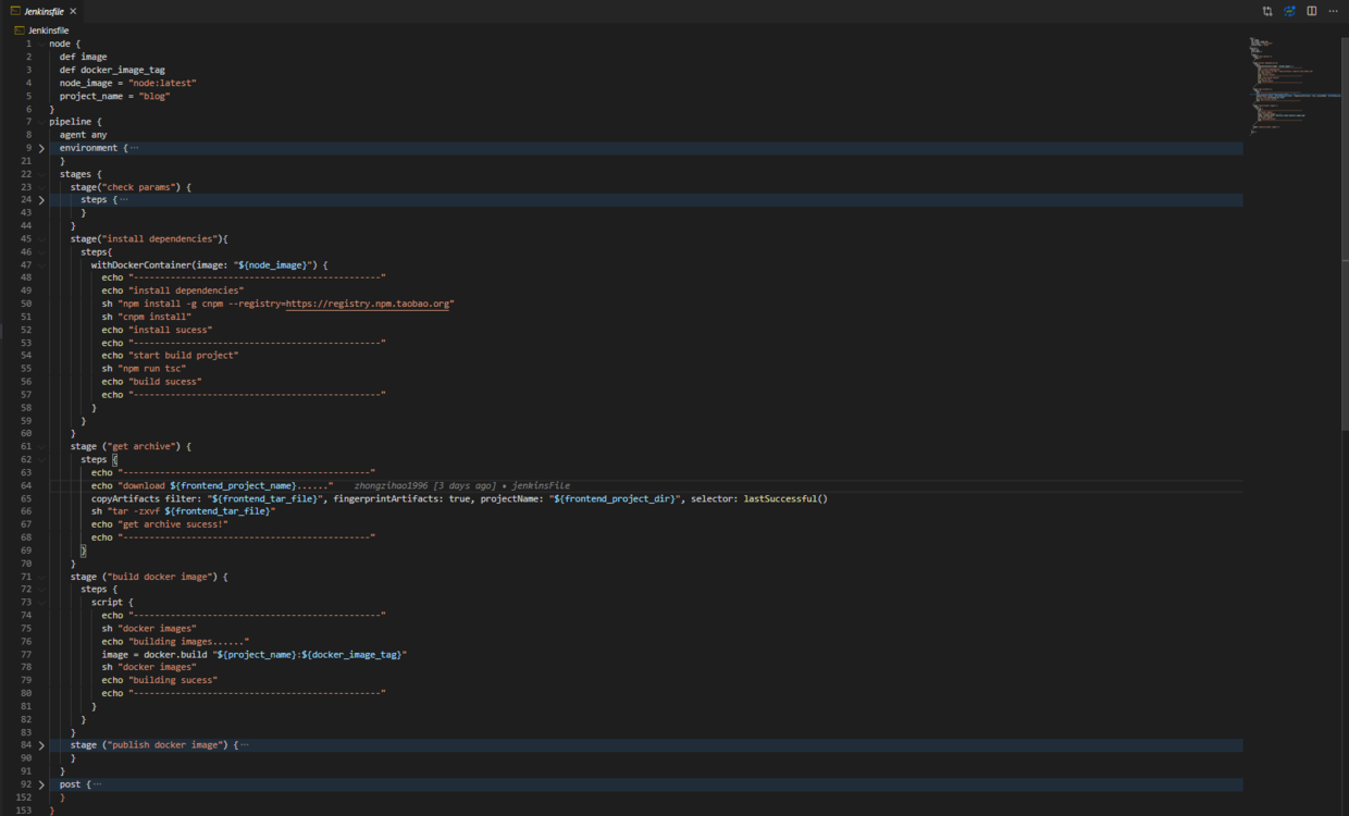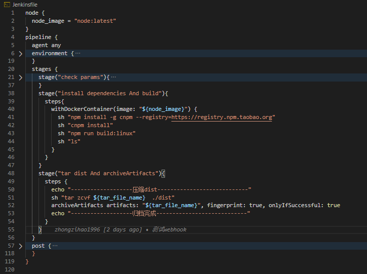 项目根目录下必须包含 Jenkinsfile 文件 Jenkinsfile 基本语法,语法比较简单,可参考 Jenkins Pipeline 语法
