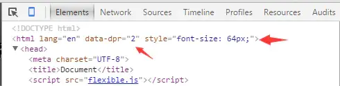 在页面中引入flexible.js后,flexible会在<html>标签上增加一个data-dpr属性和font-size样式(如下图)。为了方便计算可以设置成100px;