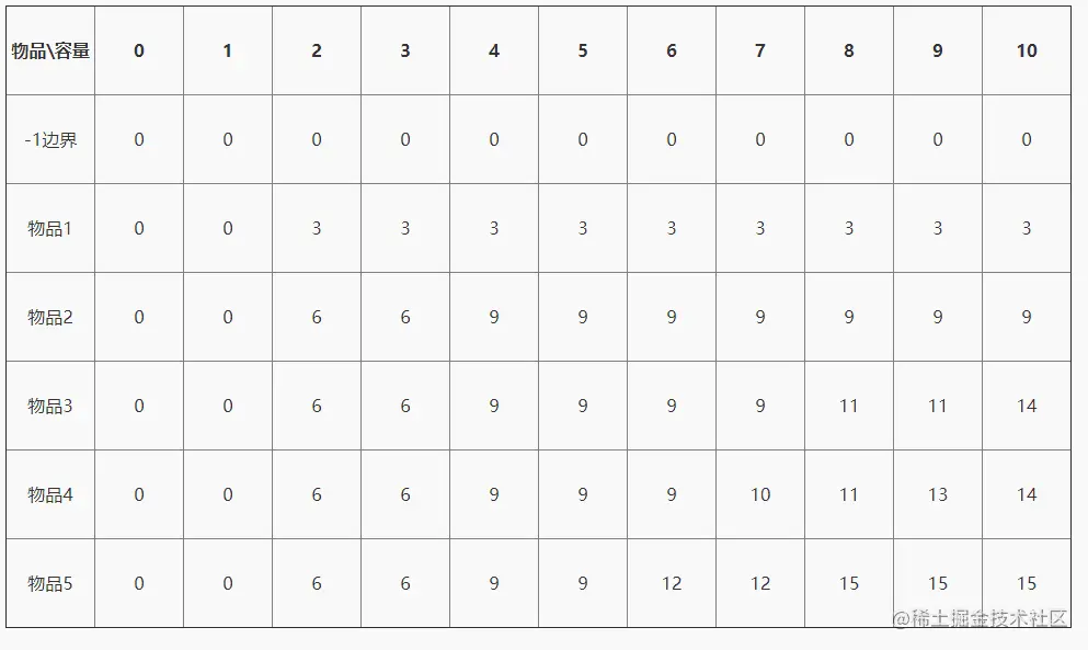 观察下表可以发现,该矩阵记录了每一个容量即状态的最优解,比如容量 7 时的最优解,我们可以找到 7 那一列最下面即 12;