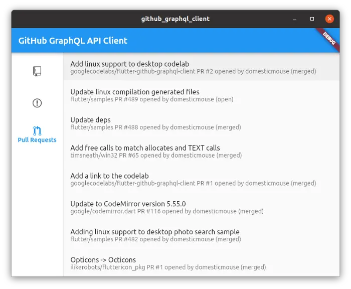 如果想了解一个Linux桌面应用的例子,并有一步一步的说明,我推荐《编写一个Flutter桌面应用》codelab,它指导你使用OAuth和GraphQL在Flutter中构建一个GitHub客户端。