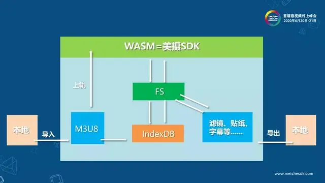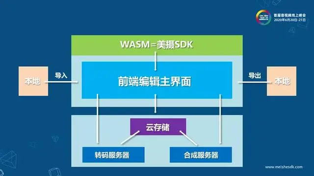 图中WASM就相当于美摄的SDK,除了浏览器本身对多线程的一些限制和渲染机制有些区别以外,其他的功能都是无差别、可使用的。中间部分是web端的js业务逻辑层,包括所有的非线性编辑处理逻辑及页面UI展示,同时它支持从本地导入上传视音频文件,合成的成片下载到本地等功能。下部是服务端,主要包括两大业务功能:一是对上传的视音频文件进行分片转码,二是对编辑完成的工程进行成片输出。这些视音频资源保存在云存储,并和用户关联一起记录在数据库中。