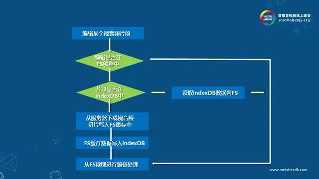 使用m3u8添加视音频素材上轨进行编辑时,WASM会检查FS缓存中是否有缓存过当前要编辑的切片。如果FS中没有缓存,则检查IndexedDB中是否下载保存过这个切片;如果已经缓存过,就可以直接读取FS中的缓存数据进行解码编辑。如果IndexedDB中也没有,就需要从服务器的云存储上下载相应的切片,并且保存在IndexedDB中供编辑使用。
