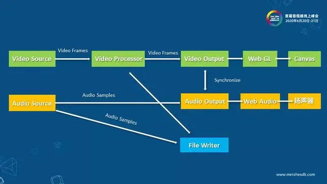 首先输入源就是视频源和音频源,视频源通过video processor以video frame的格式进行调度,这里包括视频文件的解码,视频格式的转换,封装等等,传给video output。音频源以audio sample的格式传给audio output,在输出之前视音频数据要以video frame的时间戳进行同步。
