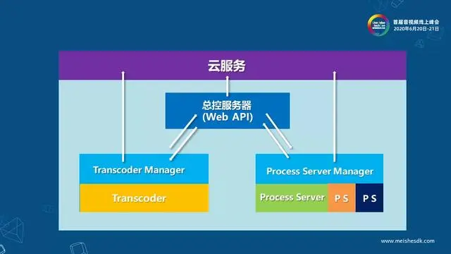 美摄云非编的服务器端的整体框架如图所示,总控服务器是负责和web端进行交互的,所有web API都是它提供的,包括用户信息、素材信息、转码任务、合成任务等。另外两个核心的功能模块是转码服务器集群和合成服务器集群,这两个服务器集群中的每一台服务器都分别部署了Transcoder Manager和Process Server Manager,它们接收到总控服务器发送的转码和合成任务时,会创建新Transcoder和ProcessServer进程来处理任务,完成后退出进程。