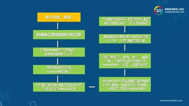 上图展示了美摄云非编的简单使用流程,先是用户注册、登录,然后创建工程或者打开已有工程,接着加载WASM相关文件,并初始化WASM里面的流媒体上下文,然后创建时间线并连接到预览窗口。开始编辑时,上传视音频资源到服务器进行转码分片,生成相应的m3u8分片信息文件,使用m3u8文件上轨进行编辑,WASM进行视音频分片预取及缓存处理。如果添加特效资源包,则下载并缓存资源包,再安装使用,编辑的工程所有数据通过xml形式保存到服务器,再通过合成任务生成出成片,供web端进行下载使用或预览。