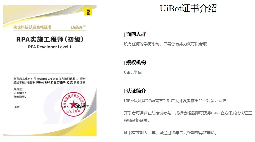 已经获得UiBot RPA实施工程师(初级)认证的开发者,在学习完《中级开发者指南》后,即可参加RPA实施工程师(中级)认证考试。