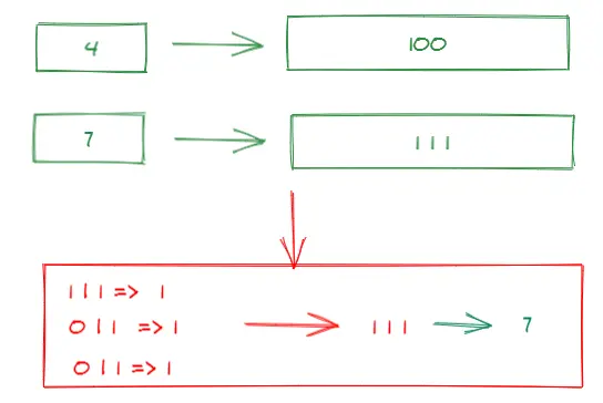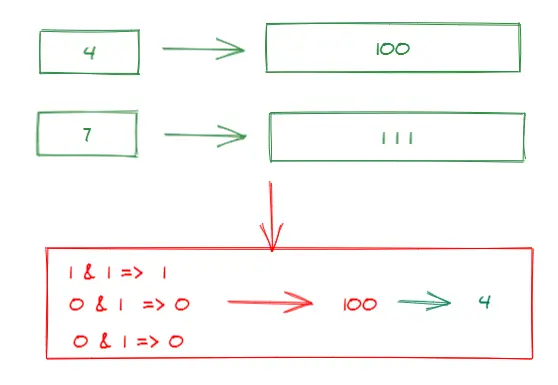 通过4和7的每一位进行比对,可以看到,每一位都进行 & 运算后的值就是我们的结果。