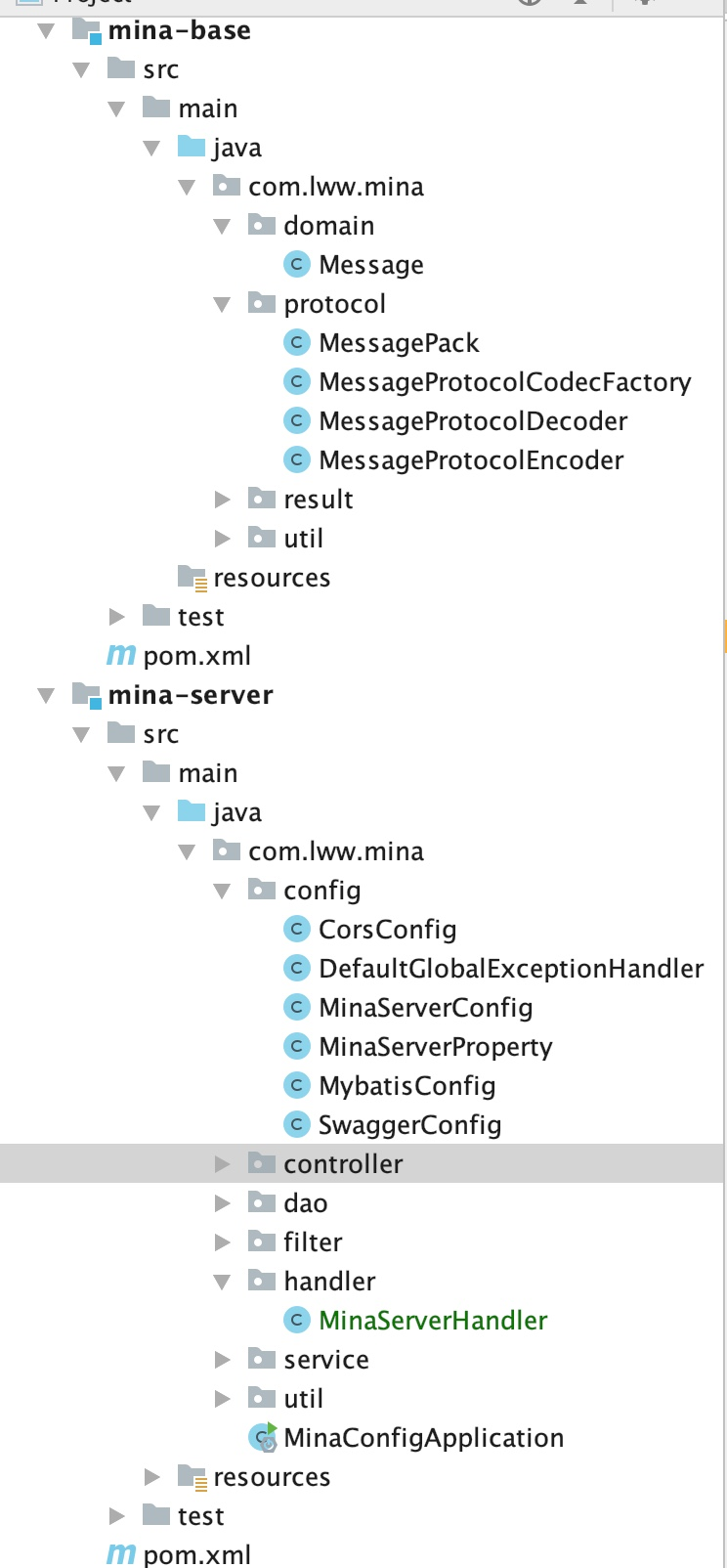 配置类已经基本完成了,还有一个MinaServerHandler,这个handler就是处理客户端消息的处理器。