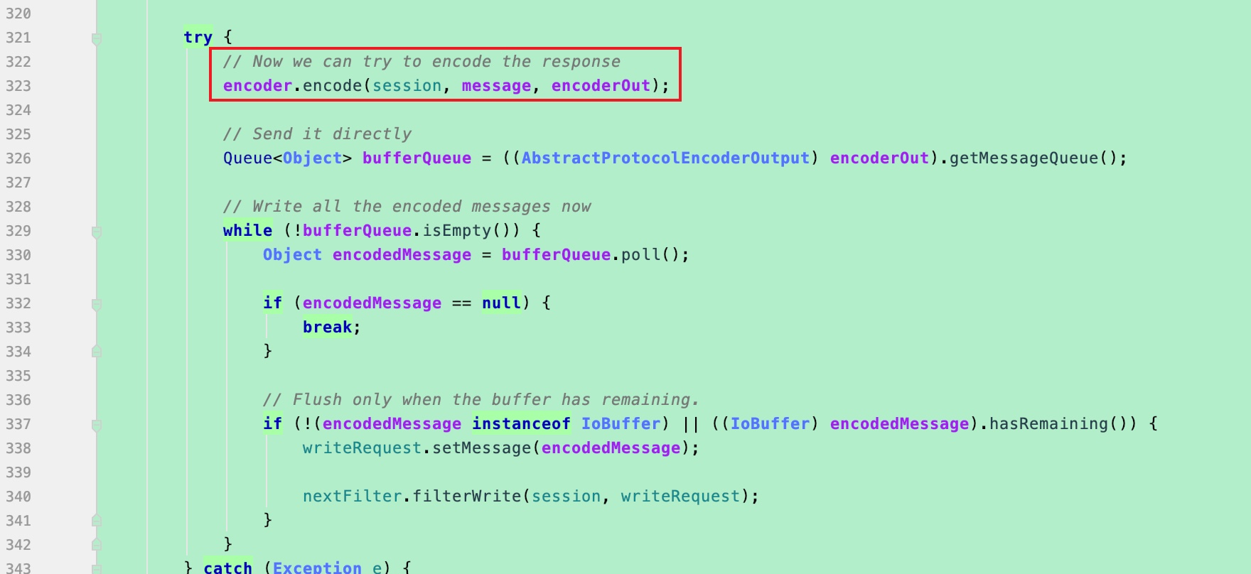 其实是在这里把消息发出去的org.apache.mina.filter.codec.ProtocolCodecFilter#filterWrite