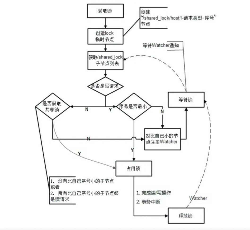 - 对于读请求:若没有比自己序号小的子节点或所有比自己序号小的子节点都是读请求,那么表 明自己已经成功获取到共享锁,同时开始执行读取逻辑,若有写请求,则需要等待。对于写请求:若自己不 是序号最小的子节点,那么需要等待。