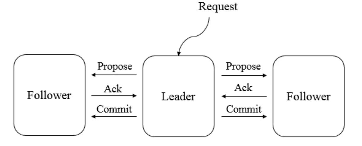即:所有事务请求必须由一个全局唯一的服务器来协调处理,这样的服务器被称为Leader服务器,余下的 服务器则称为Follower服务器,Leader服务器负责将一个客户端事务请求转化成一个事务Proposal(提 议),并将该Proposal分发给集群中所有的Follower服务器,之后Leader服务器需要等待所有 Follower服务器的反馈,一旦超过半数的Follower服务器进行了正确的反馈后,那么Leader就会再次向 所有的Follower服务器分发Commit消息,要求其将前一个Proposal进行提交,类似2pc