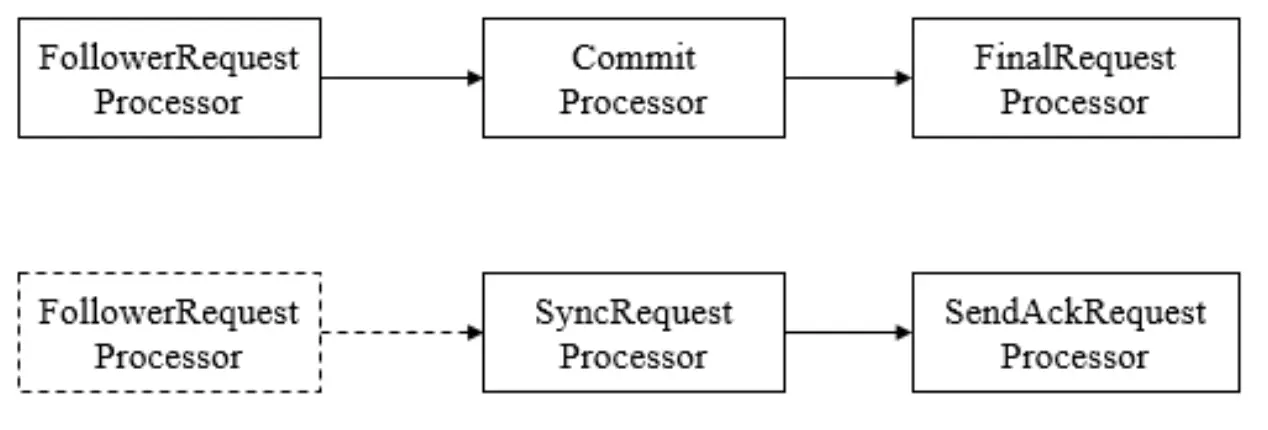- SendAckRequestProcessor : 事务日志记录反馈,完成日志记录后,向Leader发送ACK消息表面完成工作。
