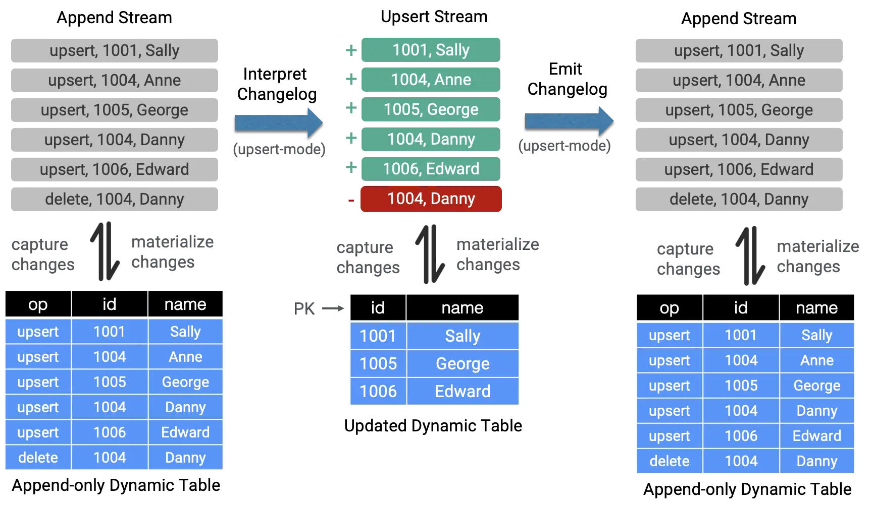 为了能够在 Table API / SQL 中使用 CDC,Flink 1.11 更新了 Table Source 与 Sink 的接口来支持 changelog 模式(参考新的 Table Source 与 Sink 接口)并且支持了 Debezium 与 Canal 格式(FLIP-105)。这一改动使动态 Table Source 不再只支持 append-only 的操作,而且可以导入外部的修改日志(插入事件)将它们翻译为对应的修改操作(插入,修改和删除)并将这些操作与操作的类型发送到后续的流中。