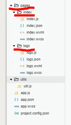 pages:每一个子文件夹代表了小程序的一个页面,比如index,和logs分别代表了两个页面。每个页面又由四个文件组成:
