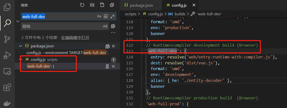 我们全局搜索 web-full-dev,可以发现入口是在 scripts\config.js文件中