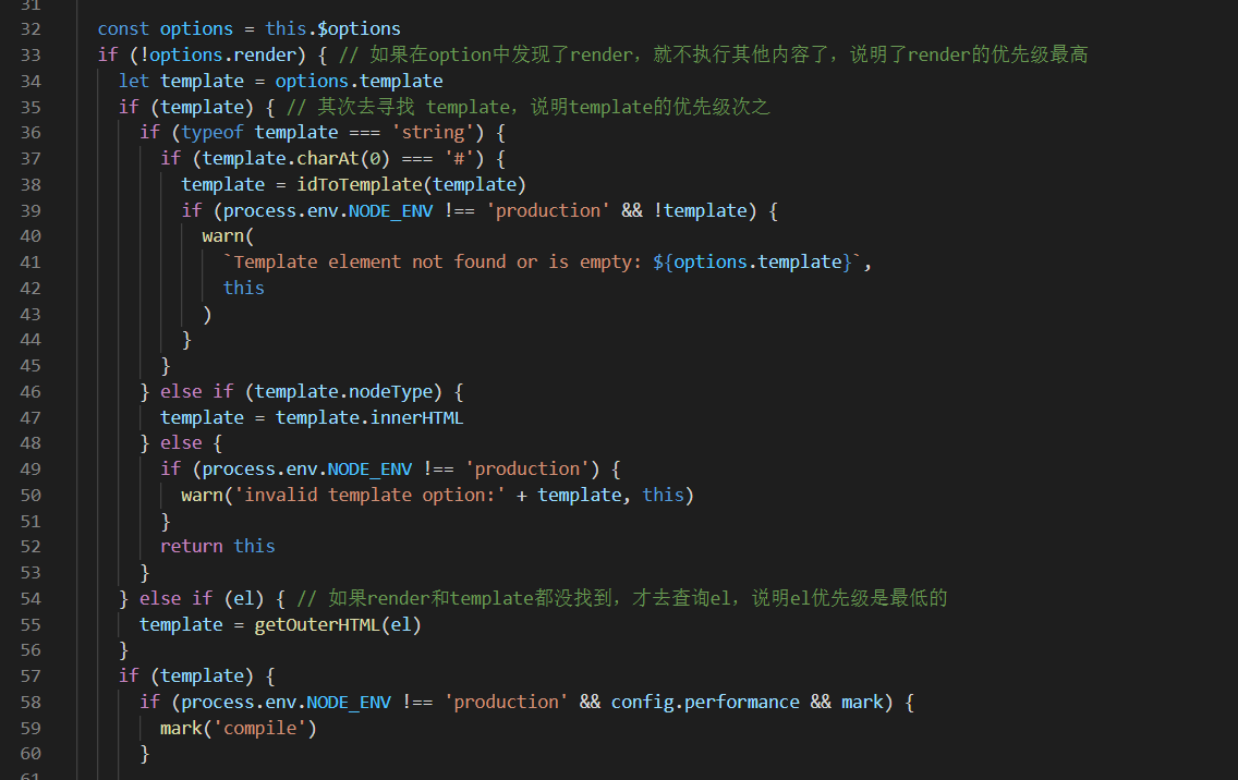 通过上述代码,我们可以得知,在 new Vue() 这个操作时,我们赋予vue模板的配置项优先级为:render -> template -> el
