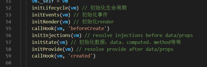 看到这里的 initState(vm) 在 callHook(vm, 'created') 的前面,也就可以知道为什么最早可以操作data中数据的钩子函数是 "created" 了