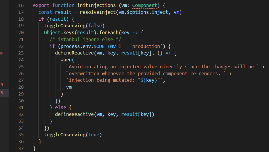 可以看到从provide中找到了inject的值之后,接下来就是对result的一些处理。可以得知result中的值是响应式的,但是在非生产环境会报出警告(说明Vue是不建议这里使用他的响应式的,想要修改Provide中的值,最好是调用Provide传入的方法)