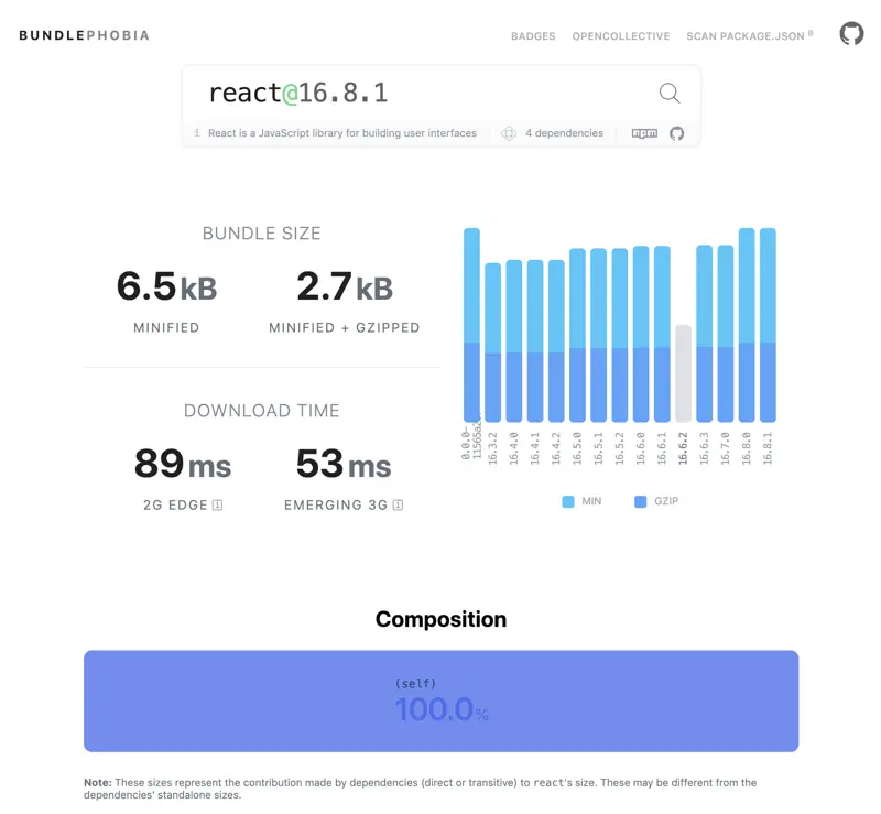 BundlePhobia用于分析npm package的依赖、bundle后的大小、下载速度预估等等,帮助你在引用一个package之前了解引入该package的代价: