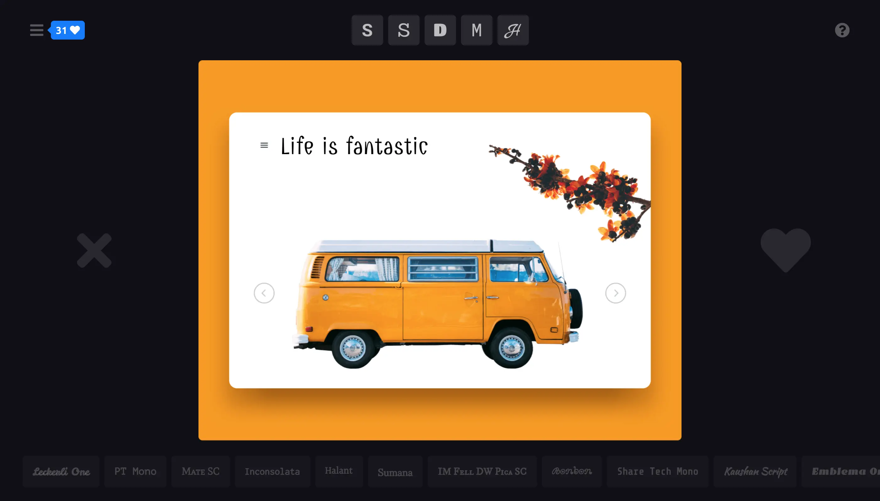 在设计或者开发时还在为使用字体发愁的同学,可以试试Fontflipper。Fontflipper只有一个目的,就是让你选到最适合你的设计的字体,上传你的设计图,添加你的文字,切换不同的字体,收藏你喜欢的,就这么简单。缺点是没有中文字体。。