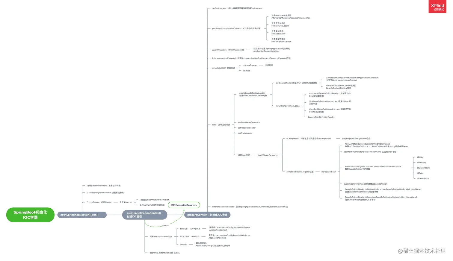 SpringApplicationRunListeners的contextPrepared和contextLoaded方法,一次在创建和准备ApplicationContext之后,但在加载之前,一次在ApplicationContext已加载但在refreshContext之前。 BeanDefinitionHolder用来持有一个BeanDefinition,BeanDefinition是对bean的描述,你也可以理解为BeanDefinition就是Spring容器中的bean。refreshContext是IOC容器最核心的部分,后面会提到。