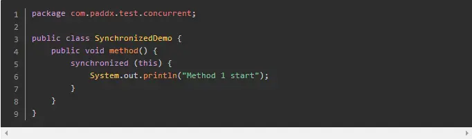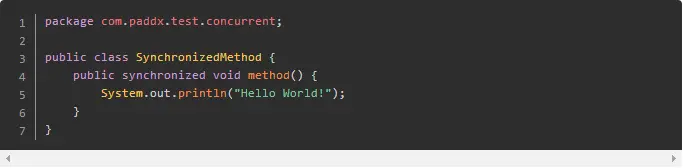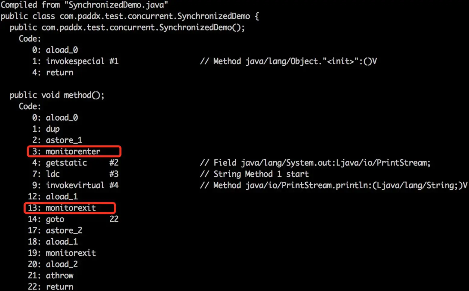 当一个线程访问同步代码块时,首先是需要得到锁才能执行同步代码,当退出或者抛出异常时必须要释放锁,那么它是如何来实现这个机制的呢?我们先看一段简单的代码: