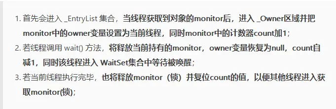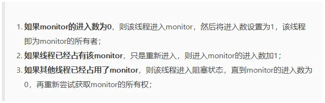 1.monitorenter:每个对象都是一个监视器锁(monitor)。当monitor被占用时就会处于锁定状态,线程执行monitorenter指令时尝试获取monitor的所有权,过程如下: