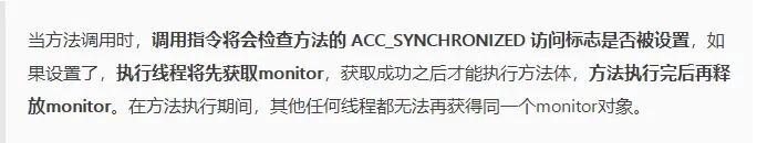 monitorenter 和 monitorexit 来完成(理论上其实也可以通过这两条指令来实现),不过相对于普通方法,其常量池中多了 ACC_SYNCHRONIZED 标示符。JVM就是根据该标示符来实现方法的同步的:两种同步方式本质上没有区别,只是方法的同步是一种隐式的方式来实现,无需通过字节码来完成。两个指令的执行是JVM通过调用操作系统的互斥原语mutex来实现,被阻塞的线程会被挂起、等待重新调度,会导致“用户态和内核态”两个态之间来回切换,对性能有较大影响。