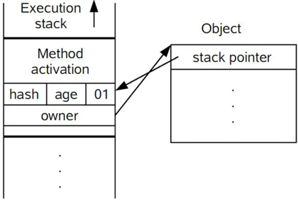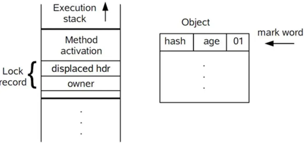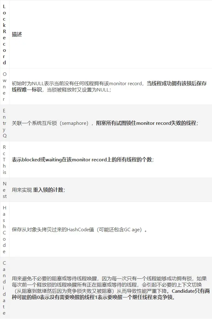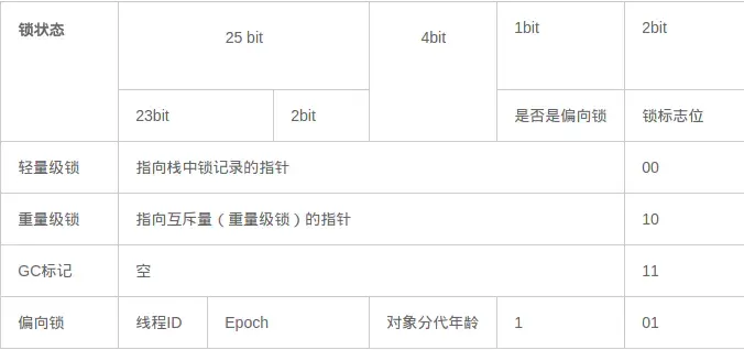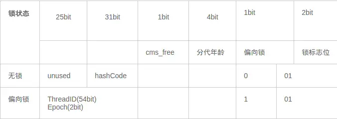 对象头的最后两位存储了锁的标志位,01是初始状态,未加锁,其对象头里存储的是对象本身的哈希码,随着锁级别的不同,对象头里会存储不同的内容。偏向锁存储的是当前占用此对象的线程ID;而轻量级则存储指向线程栈中锁记录的指针。从这里我们可以看到,“锁”这个东西,可能是个锁记录+对象头里的引用指针(判断线程是否拥有锁时将线程的锁记录地址和对象头里的指针地址比较),也可能是对象头里的线程ID(判断线程是否拥有锁时将线程的ID和对象头里存储的线程ID比较)。