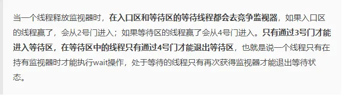 如上图所示,一个线程通过1号门进入Entry Set(入口区),如果在入口区没有线程等待,那么这个线程就会获取监视器成为监视器的Owner,然后执行监视区域的代码。如果在入口区中有其它线程在等待,那么新来的线程也会和这些线程一起等待。线程在持有监视器的过程中,有两个选择,一个是正常执行监视器区域的代码,释放监视器,通过5号门退出监视器;还有可能等待某个条件的出现,于是它会通过3号门到Wait Set(等待区)休息,直到相应的条件满足后再通过4号门进入重新获取监视器再执行。