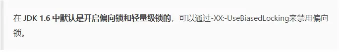在JDK5中偏向锁默认是关闭的,而到了JDK6中偏向锁已经默认开启。如果并发数较大同时同步代码块执行时间较长,则被多个线程同时访问的概率就很大,就可以使用参数-XX:-UseBiasedLocking来禁止偏向锁(但这是个JVM参数,不能针对某个对象锁来单独设置)。