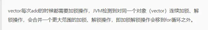 在运行这段代码时,JVM可以明显检测到变量vector没有逃逸出方法vectorTest()之外,所以JVM可以大胆地将vector内部的加锁操作消除。