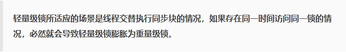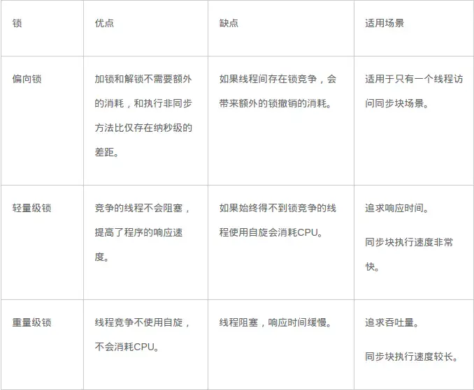 各种锁并不是相互代替的,而是在不同场景下的不同选择,绝对不是说重量级锁就是不合适的。每种锁是只能升级,不能降级,即由偏向锁->轻量级锁->重量级锁,而这个过程就是开销逐渐加大的过程。