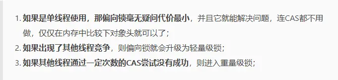 偏向锁是在单线程执行代码块时使用的机制,如果在多线程并发的环境下(即线程A尚未执行完同步代码块,线程B发起了申请锁的申请),则一定会转化为轻量级锁或者重量级锁。