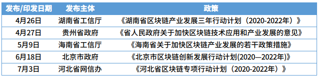 4月26日,湖南省工信厅率先发布《湖南省区块链产业发展三年行动计划(2020-2022年)》,提出到2022年,建成10个以上区块链公共服务平台,推动3万家企业上链;4月27日,贵州省政府发布《省人民政府关于加快区块链技术应用和产业发展的意见》,提 出到2022年全省建设3至5个区块链开放创新平台及公共服务平台的计划;5月9日,海南省工信厅发布《海南省关于加快区块链产业发展的若干政策措施》,提出组建区块链联合创新平台、设立区块链产业基金等10条发展措施;6月18日,北京市政府发布《北京市区块链创新发展行动计划(2020—2022年)》,明确20项重点任务;7月3日,河北网信办发布《河北省区块链专项行动计划(2020-2022年)》,提出5个方面15项重点工作。